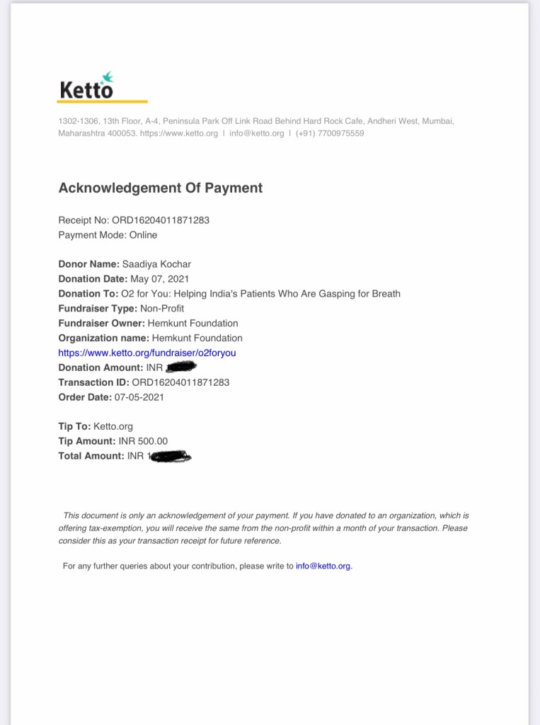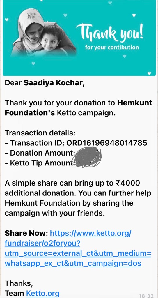 Incase you donate to Ketto, the acknowledgement of receipt will be sent on your phone and it will look like the one below or it can be downloaded from their website.